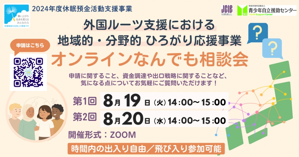 「外国ルーツ支援における地域的・分野的ひろがり応援事業」の公募に関して、団体の皆さまが自由にご相談いただける「なんでも相談会」を開催します。