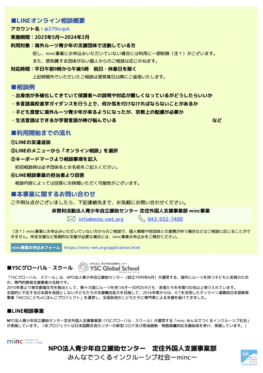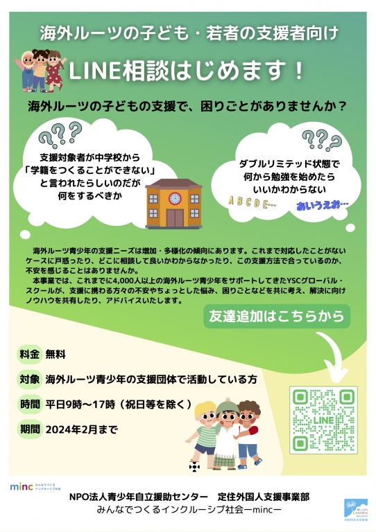 これまでに4,000人以上の海外ルーツ青少年をサポートしてきたYSCグローバル・ スクールのminc事業では、このようなお悩みに対する「LINE相談」を実施しています。