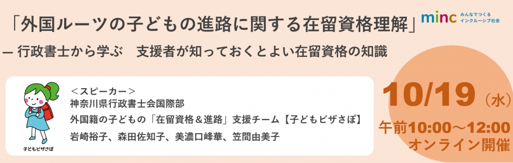 今回の講演では、外国ルーツの子どもたちのための進路を考えるフローチャートを作成している、神奈川県行政書士会の「子どもビザさぽ」メンバーの皆さまに、外国ルーツの子どもの進路サポートをする上で、配慮しなければならない点をお話いただきます。